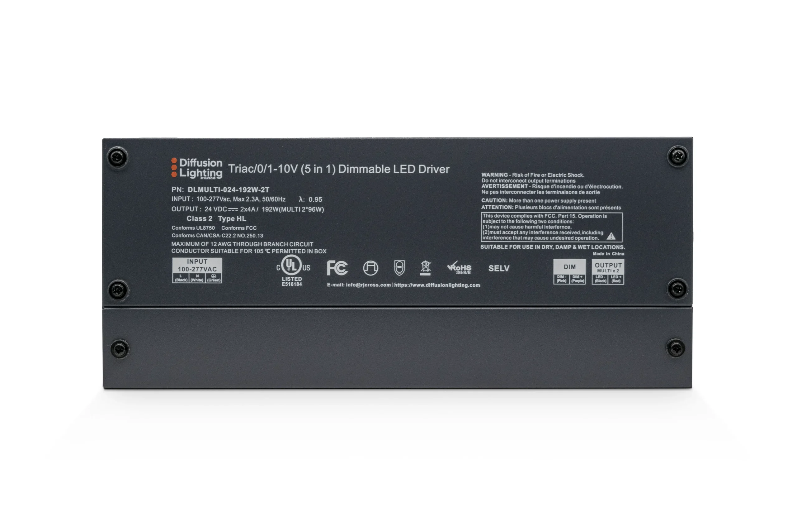Diffusion DLMULTI-024-192W-2T is a two-tap Dimmable LED Driver that works with Forward / Reverse phase, ELV, Triac, or 0-10V Dimmers.