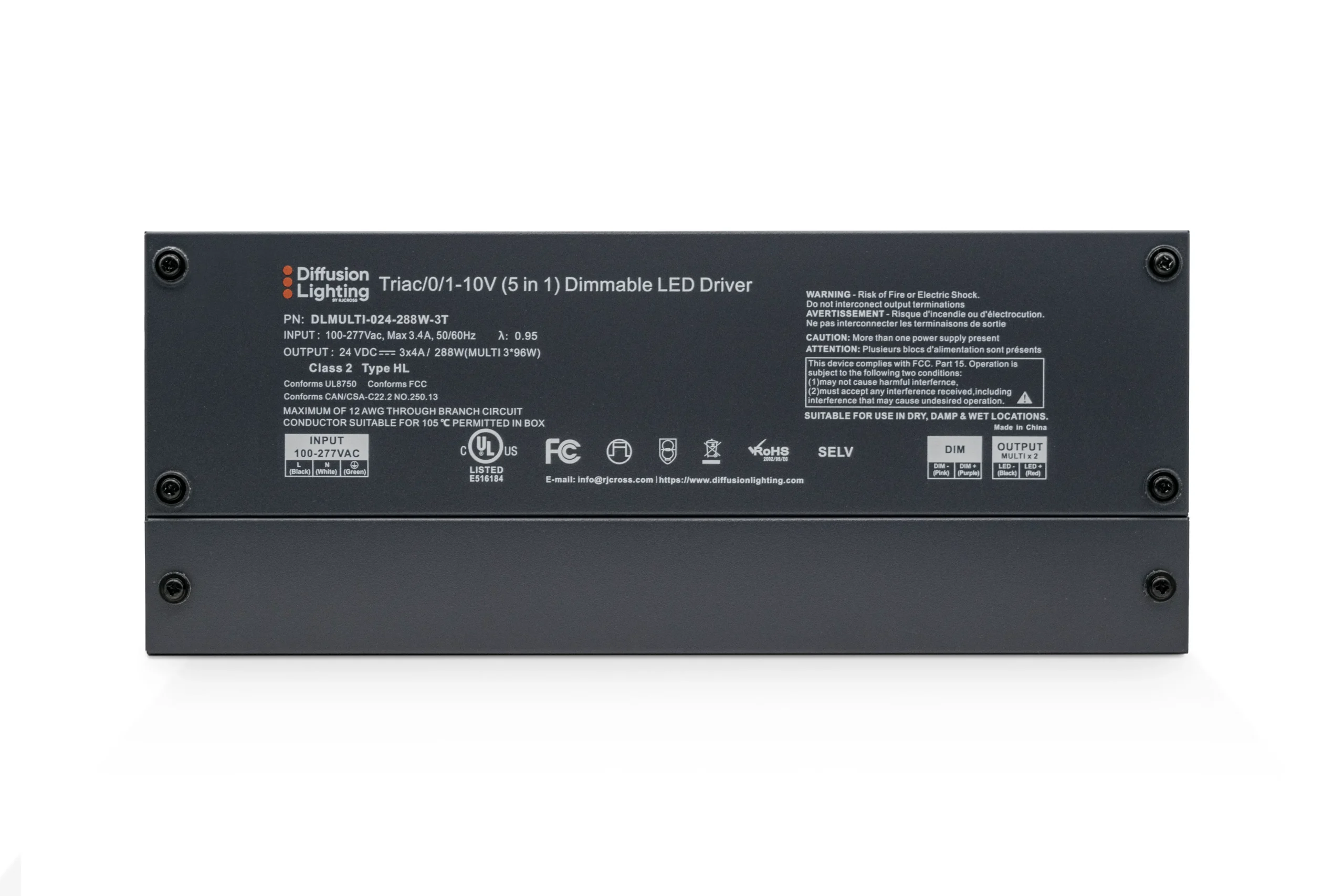 Diffusion DLMULTI-024-288W-3T is a three-tap Dimmable LED Driver that works with Forward / Reverse phase, ELV, Triac, or 0-10V Dimmers.
