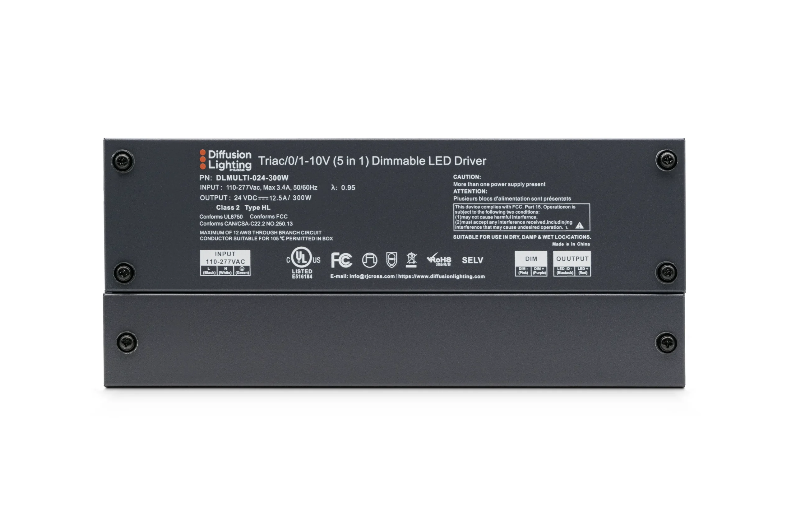 Diffusion DLMULTI-024-300W is a Dimmable LED Driver that works with Forward / Reverse phase, ELV, Triac, or 0-10V Dimmers.