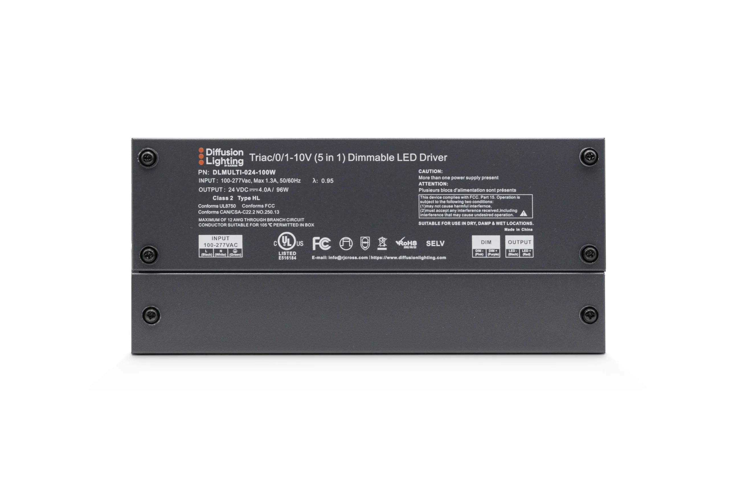 Diffusion DLMULTI-024-60W is a Dimmable LED Driver that works with Forward / Reverse phase, ELV, Triac, or 0-10V Dimmers.